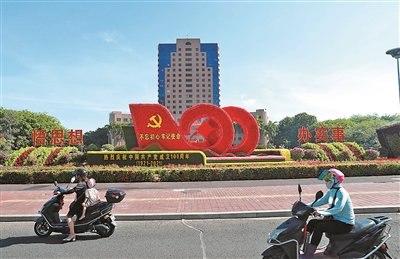 为庆祝中国共产党成立100周年,营造喜庆祥和的城市氛围,我市以中国共产党成立100周年为主题,在市政府广场前增设花卉造型,以100字设计成一艘红船,搭配丰富多变的景观表现形式,呈现花团锦簇、枝繁叶茂的靓丽景观,喜迎建党100周年,展现儋州积极向上的城市形象和开拓创新的精神。图为市政府广场前的花坛绿雕造型。 儋州融媒全媒体记者 黎有科 摄