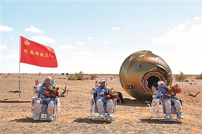 返回舱舱门打开,医监医保人员上前与航天员交流。航天员聂海胜、刘伯明、汤洪波出舱后表情轻松,挥手向大家致意。