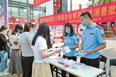 当天,市市场监管局依托洋浦分局、各基层所设置宣传咨询台,向广大市民发放《消费者权益保护法》《食品安全法》《海南自由贸易港反消费欺诈规定》等宣传资料,为市民普及依法维权知识。在现场,记者还看到,不少市民学习热情十分高涨,抓住机会纷纷上前“补课”,频频与现场工作人员进行互动问答,增强运用法律知识进行消费维权的本领。