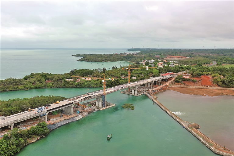 下浦港大桥是海南环岛旅游公路项目五工区控制性工程之一,大桥全长418.48米,其中主桥采用悬浇预应力钢筋混凝土变截面连续箱梁,引桥采用预应力砼(后张)简支小箱梁。“施工中,我们始终将质量安全管控摆在突出位置,克服夏季天气多变等不利因素,科学组织施工,加大资源投入,加快项目建设进度。”环岛旅游公路项目五工区工程技术部部长齐会军说。