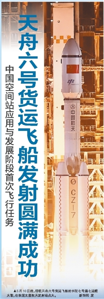 5月10日21时22分,搭载天舟六号货运飞船的长征七号遥七运载火箭,在我国文昌航天发射场点火发射,约10分钟后,船箭成功分离并进入预定轨道,之后,飞船太阳能帆板顺利展开工作,发射取得圆满成功。后续,天舟六号货运飞船将与在轨运行的空间站组合体进行交会对接。