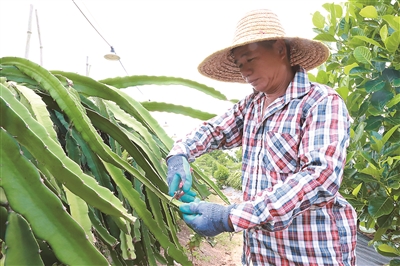 “我和妻子现在都在基地务工,两人每月收入9000元,主要负责修剪枝条、锄草、施肥、采收等工作,还能照顾家里的老人和孩子,我很满足。”下黄村村民吴小雄说,得益于火龙果产业基地带动就业,夫妻二人有稳定收入,小日子过得有滋有味。