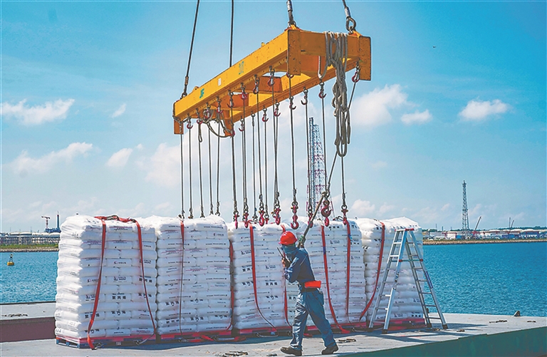 9月6日,在洋浦经济开发区海南炼化乙烯码头,工作人员正在将聚乙烯、聚丙烯等产品装船作业。