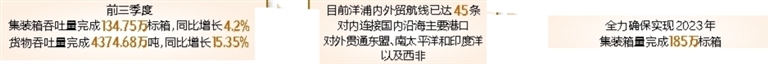 航线的加密,进一步带动洋浦港口集装箱吞吐量的上扬。前三季度,洋浦港口集装箱吞吐量完成134.75万标箱,同比增长4.2%;货物吞吐量完成4374.68万吨,同比增长15.35%,港航指标持续增长。
