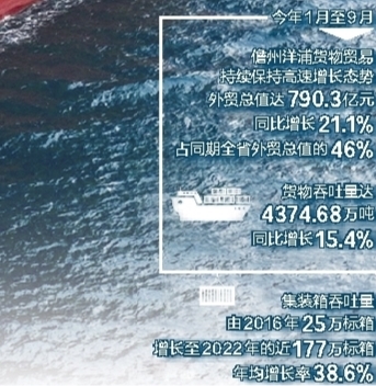 产业的集群发展,带来货物大流通。这也是助力洋浦能够率先一步入选国家物流枢纽的基础门槛。数据显示,今年1月至9月,儋州洋浦货物贸易持续保持高速增长态势,外贸总值达790.3亿元,同比增长21.1%,占同期全省外贸总值的46%。