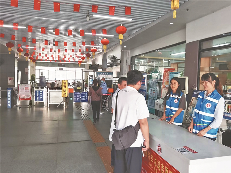 记者在车站大厅内看到,该局与车站工作人员身穿志愿者马甲,帮助旅客解决出行时遇到的困难,解答一些关于购票、车次、发车时间等方面问题,提供班线咨询、购票导乘等服务,同时还维持车站现场秩序,组织大家有序购票、入站乘车。此外,工作人员还向旅客宣传文明旅游知识,不间断在车站内巡查,提醒候车旅客不要在座椅上躺卧,不乱丢垃圾。