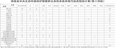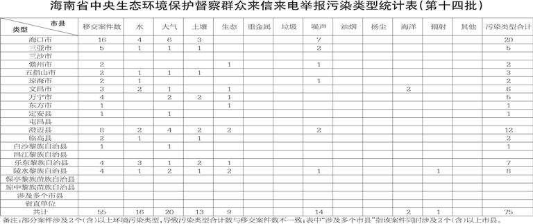 第十四批55件群众信访举报件共涉及七种污染类型问题,其中大气污染问题20件、水污染问题16件、噪声污染问题14件、土壤污染问题13件、生态污染问题9件、海洋污染问题2件和辐射污染问题1件。