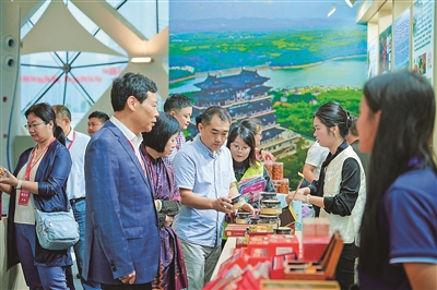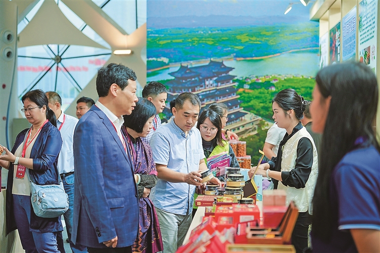 本届休博会集展览、销售、旅游、娱乐、采购于一体。一步入展区,儋州馆格外显眼。儋州馆面积243平米,在设计上融合古建筑风格,无论是“诗乡歌海 、大美儋州”“儋州因洋浦而更加开放,洋浦因儋州而更有深度”醒目的城市形象定位,还是东坡书画、调声表演,又或是非遗土糖、石花水洞矿石、海花岛丰富业态的展示,都让人流连忘返。