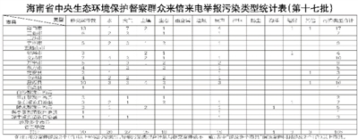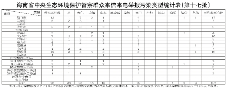 第十七批70件群众信访举报件共涉及八种污染类型问题,其中大气污染问题27件、水污染问题20件、噪声污染问题19件、生态污染问题18件、土壤污染问题15件、辐射污染问题3件、其他污染问题3件和海洋污染问题1件。