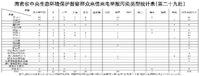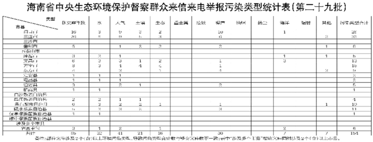 第二十九批85件群众信访举报件共涉及七种污染类型问题,其中大气污染问题41件、水污染问题32件、噪声污染问题30件、土壤污染问题21件、生态污染问题16件、海洋污染问题7件、其他污染问题7件。