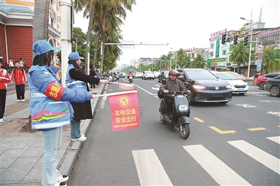 “你好,请在线内等候绿灯。”“你好,请佩戴头盔。”当天,在活动中,志愿者们冒着严寒,手拿小红旗,协助交警在那大城区主要路口,对不按道行驶、不戴安全头盔、闯红灯、逆向行驶、违法载人以及行人不走人行横道、不按照交通信号灯指示通行等不文明交通行为进行劝导、提醒,并向违法行为人宣传交通安全基本常识。