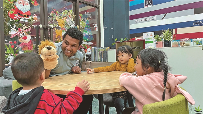 近日,在儋州世爵艺术培训中心,孩子们在课堂内与老师进行英语口语的日常交流,他们边玩边学,气氛轻松活跃,互动频频。
