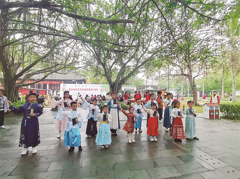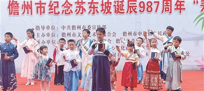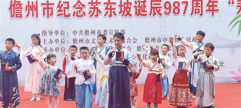 另一边,一场东坡诗意满满的舞蹈,让大家又沉浸在东坡诗句:“欲把西湖比西子,淡妆浓抹总相宜”的情景中,活动还通过朗诵东坡诗词、歌曲演唱、古琴演奏、龙年送福、书法展示等形式,表达了儋州人对东坡居儋敷扬文教,传播中原文化的敬仰之情。“让小孩从小感受东坡文化,体会当年东坡先生在儋州的生活方式,从小得到熏陶,学习先人的智慧,成为与先人一样的人。”儋州市民王雨桐看着儿子背诵东坡诗词时说。