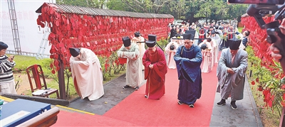 东坡书院内,清茶清果祭拜,鼓声礼乐齐鸣,古风淳淳。大家诵读先生经典诗文,缅怀先生功业,表达儋州人民对苏东坡这位千年文化巨擘的崇敬之情。在苏东坡雕像前,礼宾从两侧三步,一步一停,走到红毯中间,在《东坡真赞》的真情歌赞后,众人理正衣冠,敬拜东坡。