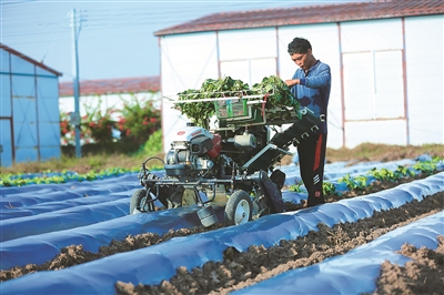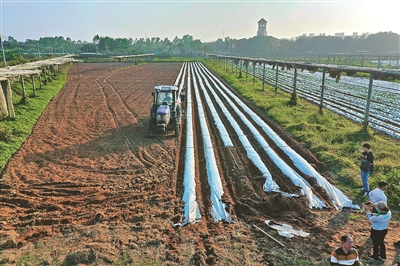 1月30日,在光村镇雪茄种植基地,机器轰鸣,一台覆膜机在基地来回穿梭,一垄垄覆盖好的地膜为基地“穿”上闪亮的“银装”,一台播种机在进行地瓜播种作业,一派机械化耕种的繁忙景象。农技专家在现场提供技术指导。