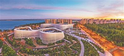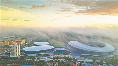 儋州市体育中心“一场两馆”是2022年第六届省运会的举办场地,可容纳3万人观看体育赛事,3个比赛场馆整体呈“品”字形排列,从远处俯瞰,犹如翻滚的波浪,体育馆和游泳馆提取“千年古盐田”的形态,通过几何抽象化处理,塑造“千年古郡 魅力儋州”的形象特征。