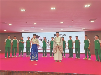4月22日晚,市第三中学高一语文组举行“读书月”经典诵读比赛,舞台上,各班教师从不同的角度,以多种演绎形式呈现古今经典篇目之美,给观众带来了一场视听盛宴。该校还组织学生在操场以诵读的形式营造书香校园氛围。