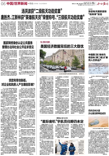 汤洪波获“二级航天功勋奖章” 唐胜杰、江新林获“英雄航天员”荣誉称号、“三级航天功勋奖章”