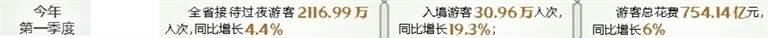 近日,省旅游和文化广电体育厅官网数据显示,今年第一季度,全省接待国内外游客3386.45万人次,同比增长5.6%,其中接待过夜游客2116.99万人次,同比增长4.4%;入境游客30.96万人次,同比增长19.3%;游客总花费754.14亿元,同比增长6%。