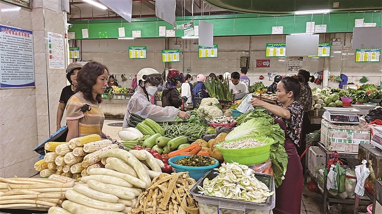 记者在中兴农贸市场看到,各类新鲜蔬菜、猪肉、水产品和水果品种丰富、码放整齐,市民采购有序。“从前天开始,受台风天气影响,部分蔬菜价格出现了小幅上涨。”一蔬菜摊主向记者介绍道。