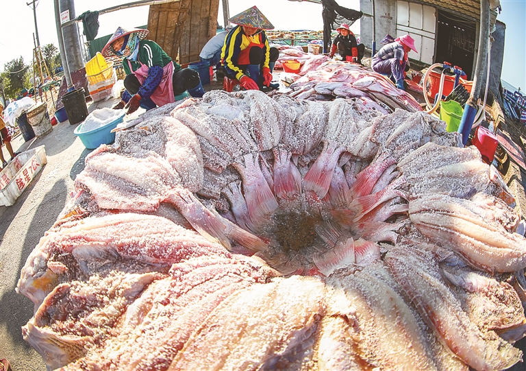 1月16日下午,冬日正好,海头镇港口村一派繁忙,渔民们在作坊里忙于赶制数百条大红鱼,迎接新春佳节。