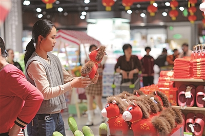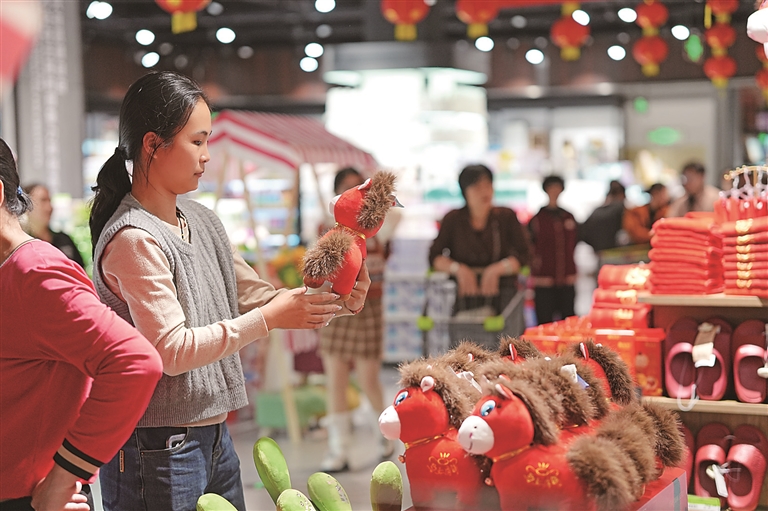 记者在商超看到,货架上商品琳琅满目,从糖果干货到春联灯笼,一应俱全。据商家介绍,近期客流量比平日增加了一倍,超市已提前备足货源,并推出多项优惠活动。“今年特别增加了马年主题装饰品和礼盒套装,很受欢迎。”此外,商超显眼位置摆放着近期在网上意外走红的“笑笑马”和“哭哭马”玩偶,趣味喜庆的造型吸引了不少消费者驻足选购。市民张女士各选购了一只玩偶,她告诉记者:“马年到,应个景!这俩小家伙,一个咧着嘴讨喜气,一个耷拉着脸挺逗趣,买回家就是图个高兴!”