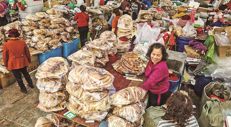 红旗农贸市场同样热闹非凡,儋州特产——红鱼成为采购焦点。许多市民专程前来挑选优质红鱼,准备作为年礼或团圆饭的必备菜肴。一位摊主一边忙着打包一边介绍:“红鱼寓意‘年年有余’,这几天每天能卖出不少,不少人一买就是好几条。”